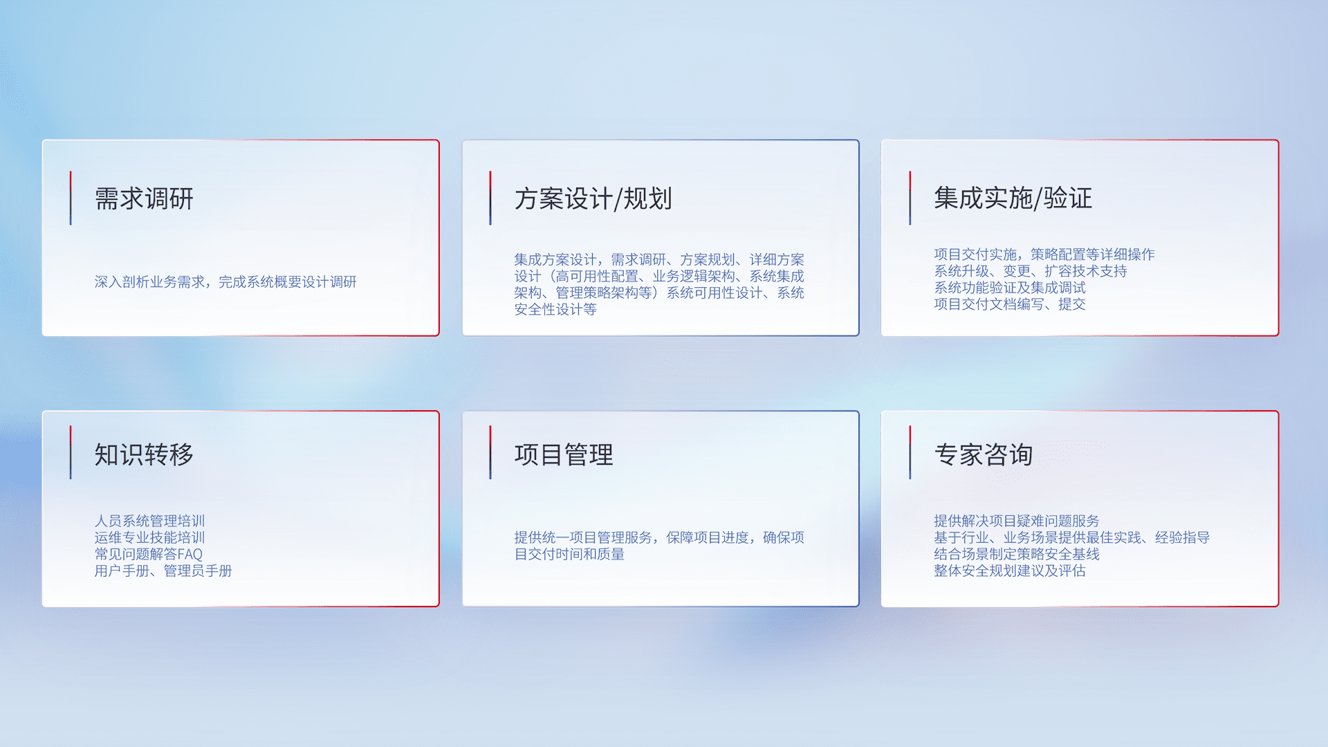 针对客户行业特性,,,将宏观的安全战略和需求,,,,通过专业的交付服务,,,,实现项目落地,,,为客户提供标准规范的集成交付服务。。。